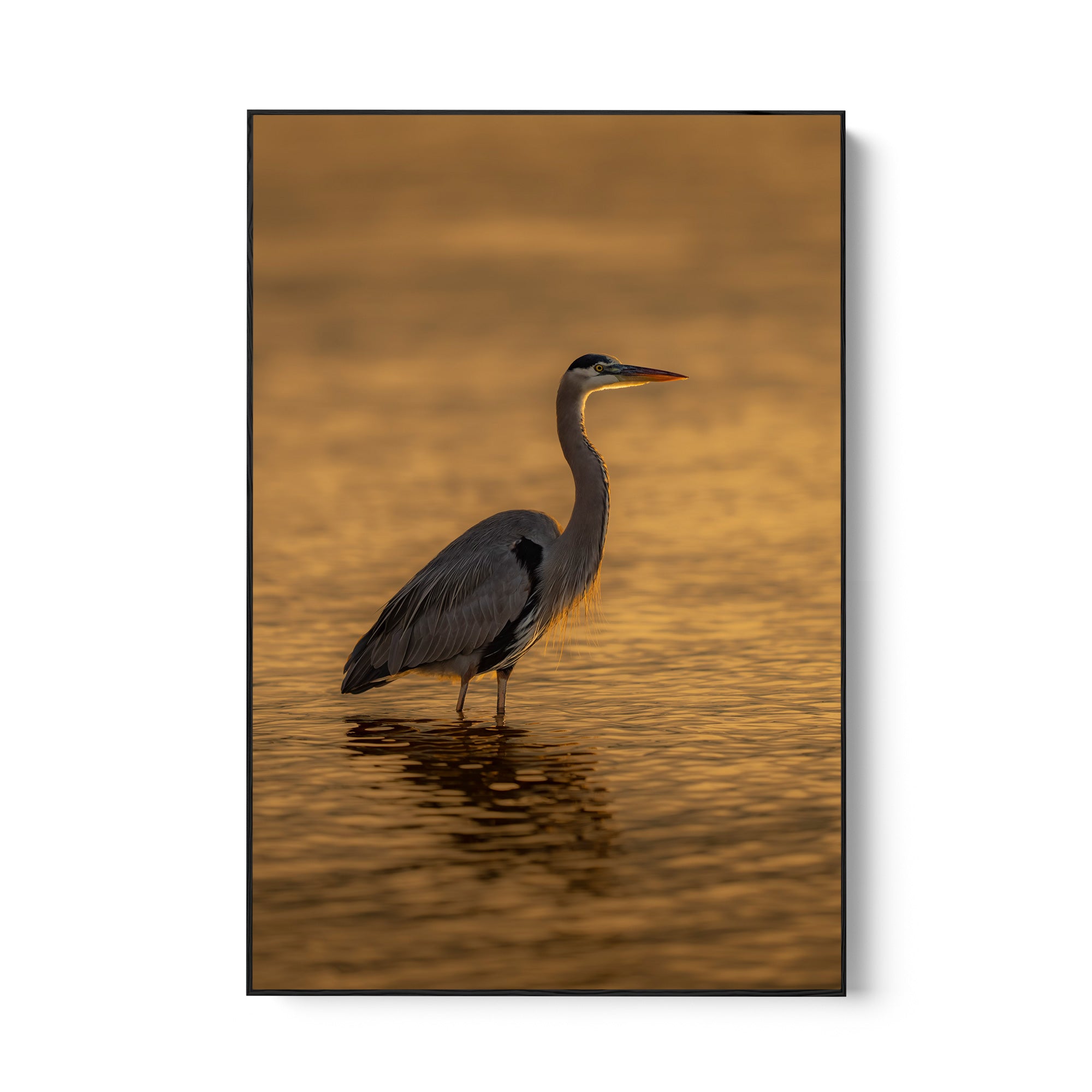 Standing majestically in shallow waters with glass-like ripples, this great blue heron welcomes a completely unique, yet always stunning, Florida sunrise.