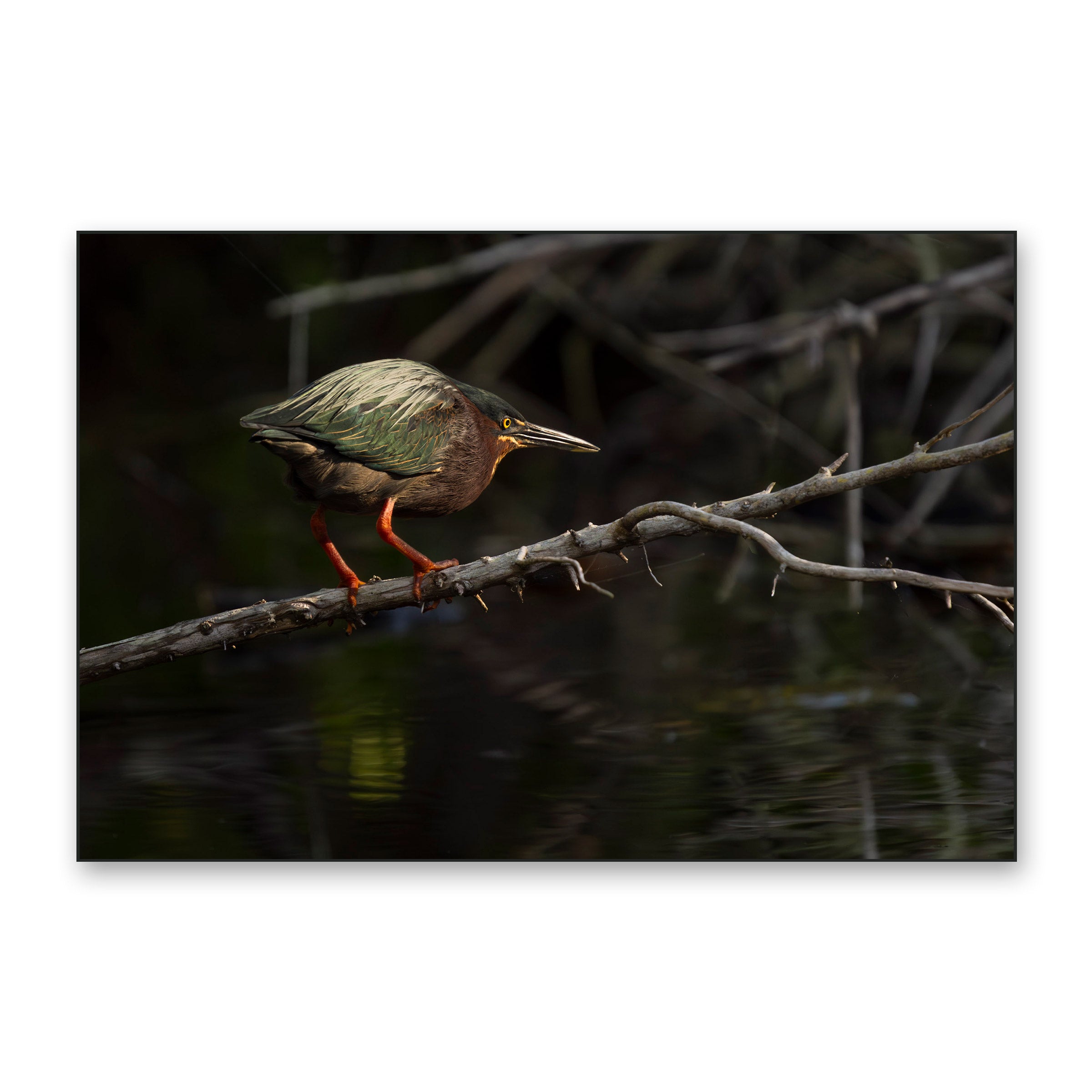Green Herons feature a fairly unique and rare shade of hunter green, and when the sun hits their plumage just right, they become quite breathtaking. Here, this heron has perched upon a felled limb, just inches above the black water below, as it hunts for its next meal.