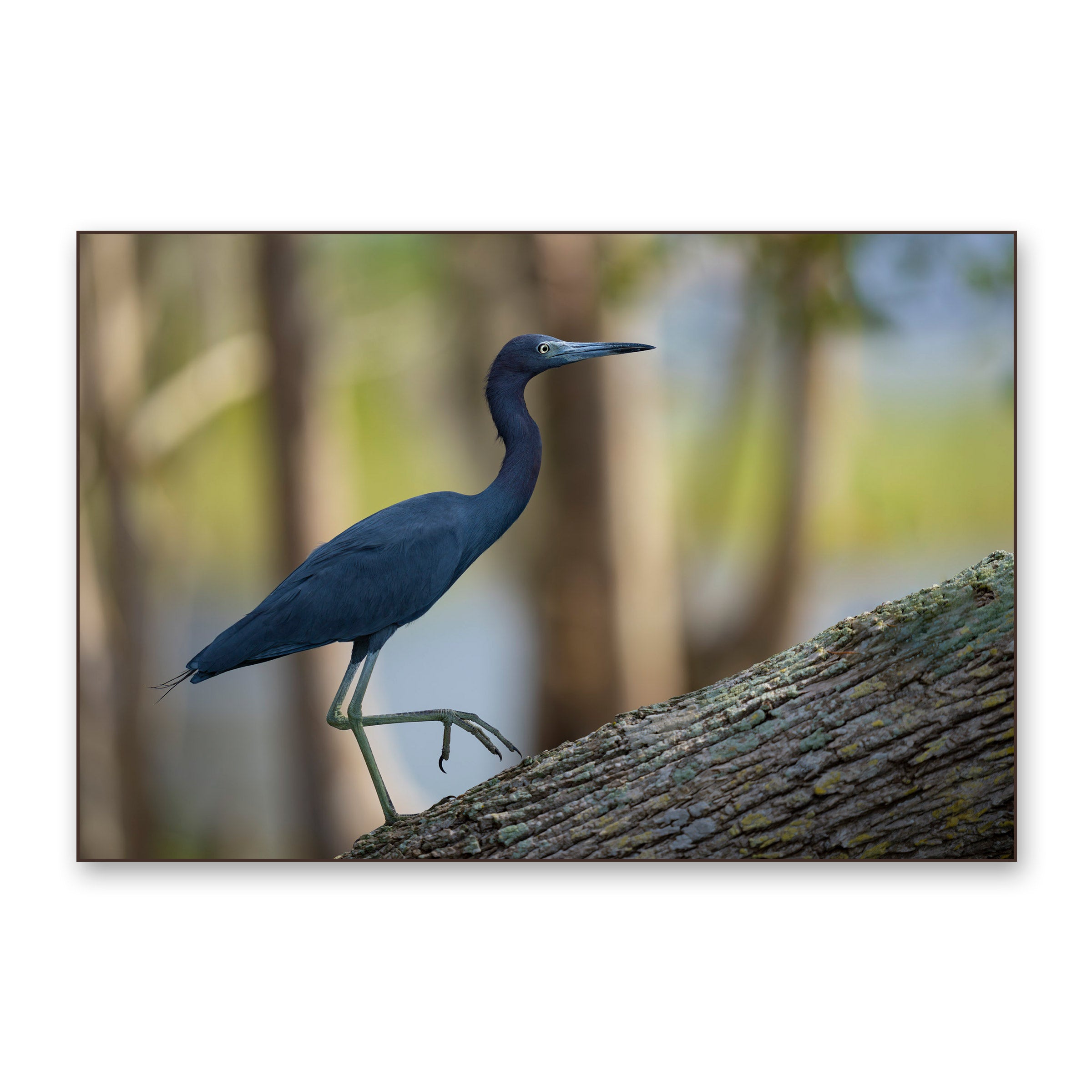 A felled tree in the swamps of south Florida is seen as a climbing and potentially hunting opportunity for this gorgeous little blue heron.