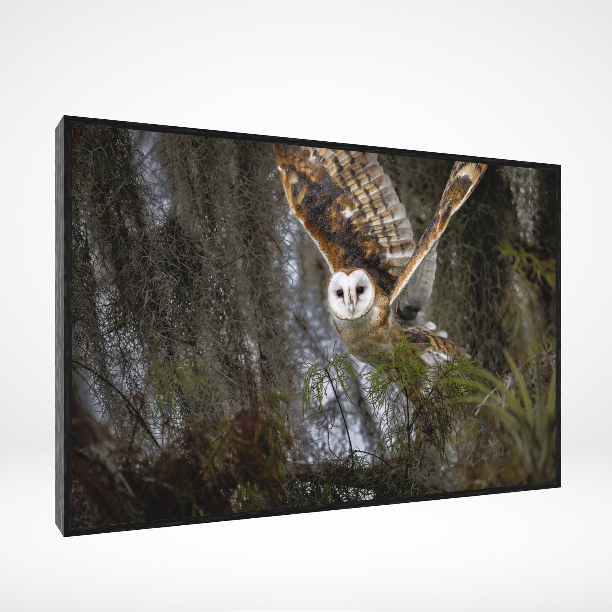 A barn owl gives up its camouflage by taking flight from the safe confines of a spanish moss-covered cypress tree.
