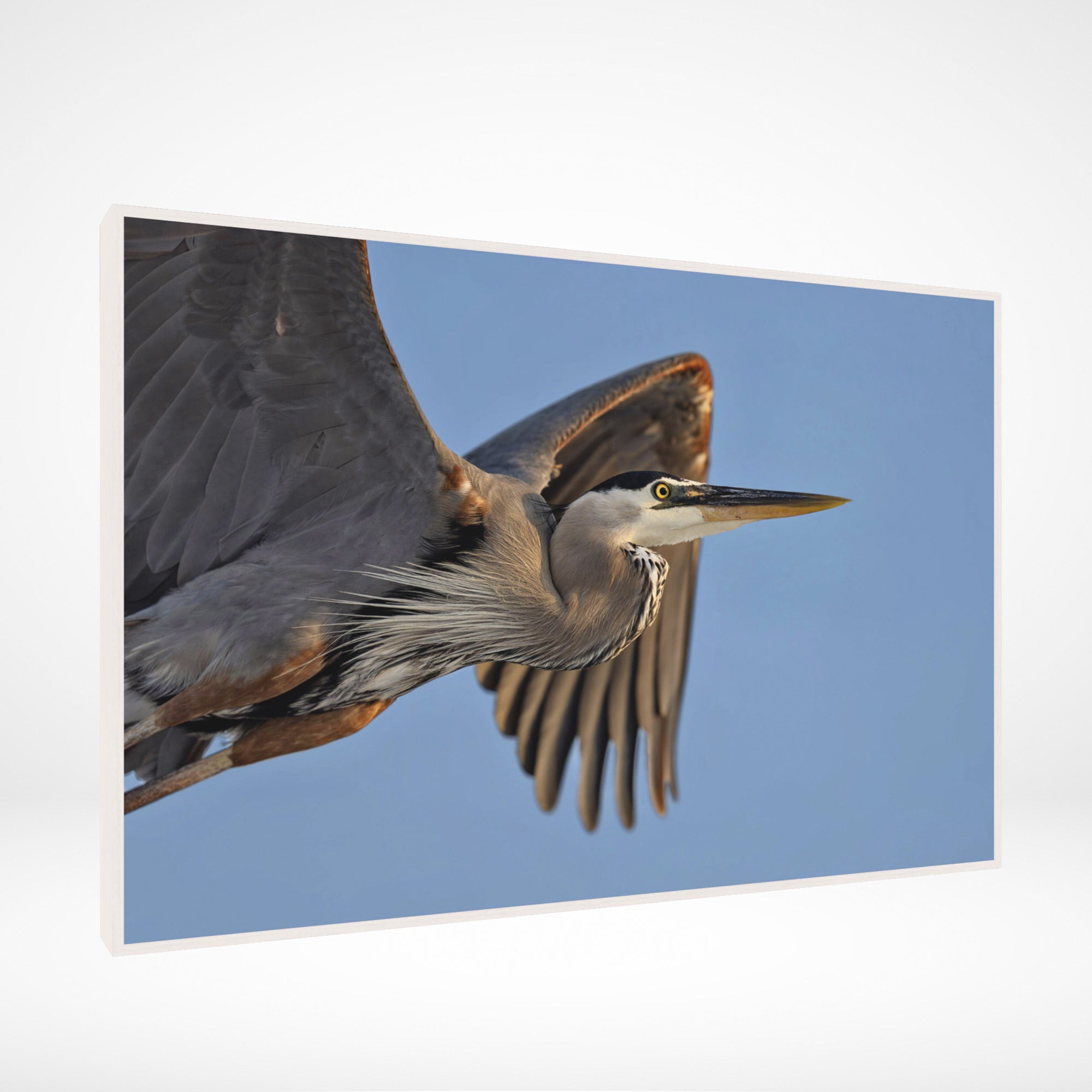 A great blue heron takes flight, and flies directly towards the rising sun.