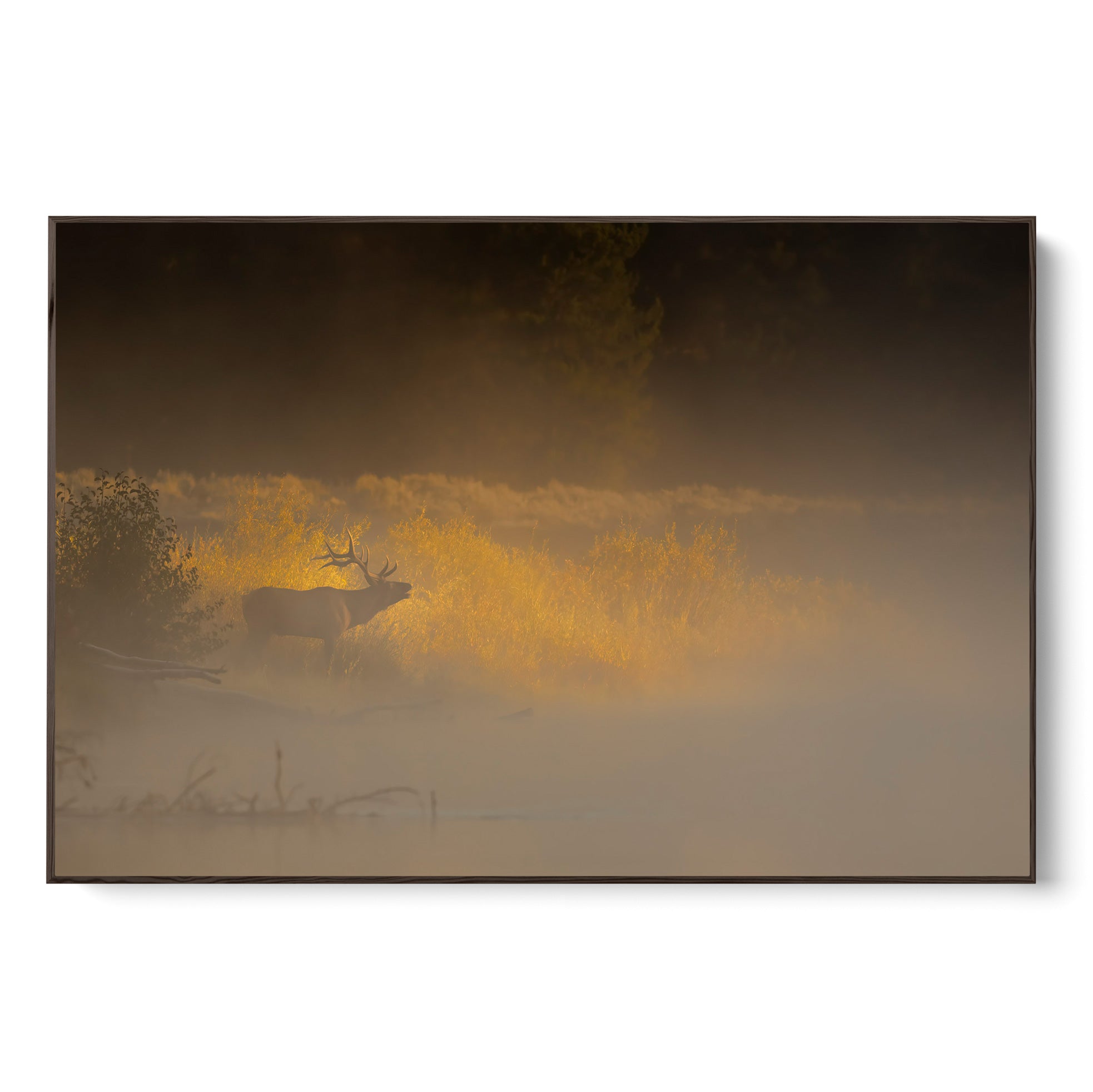 This bull elk is bugling into the fog, directing his harem of cow elk as to where they should proceed as the sun rises.