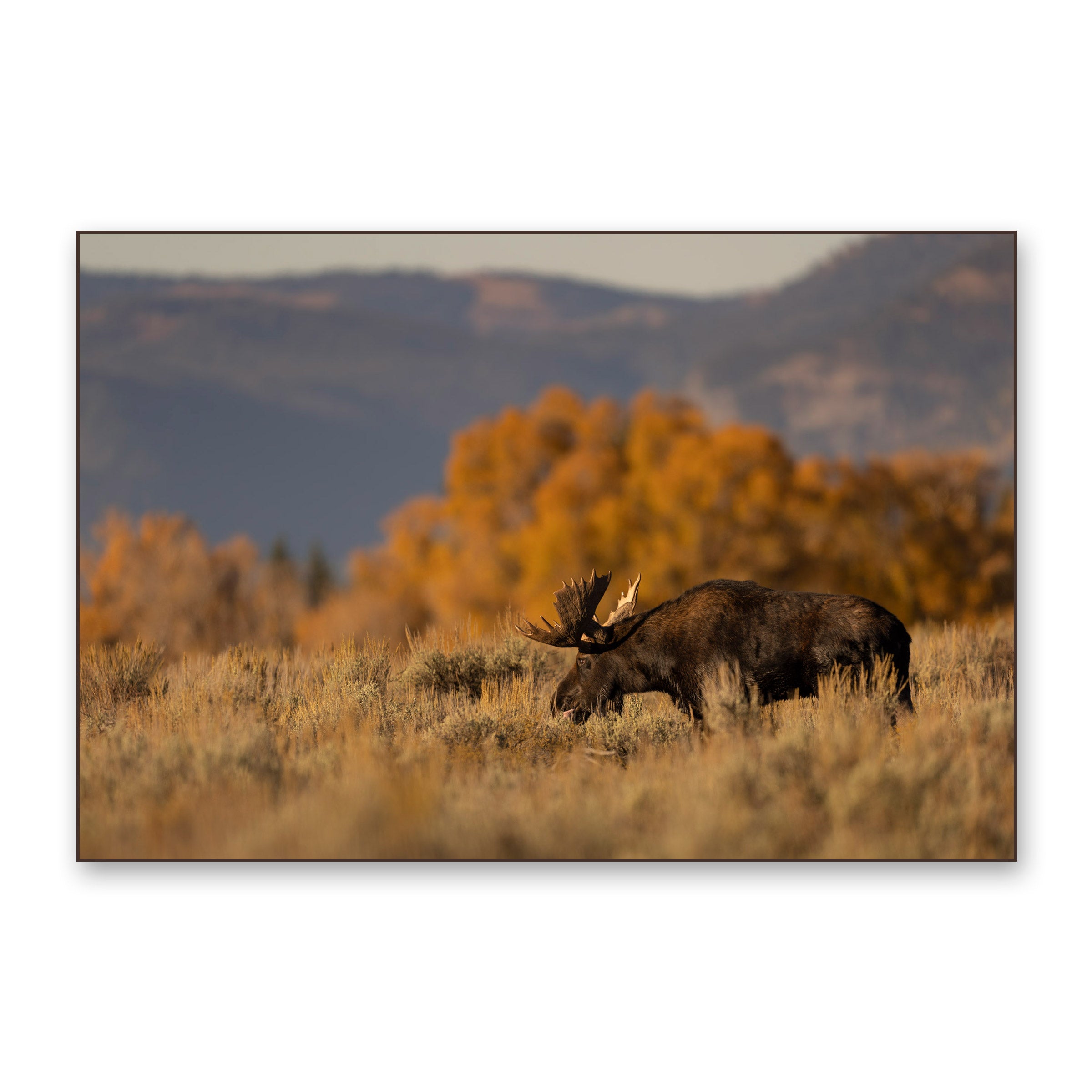 As the sun fades, signaling the coming end of the day, so also are the cottonwoods fading along the shadows of the Teton Range. No doubt, this moose knows that change is rapidly approaching, and he must be prepared.