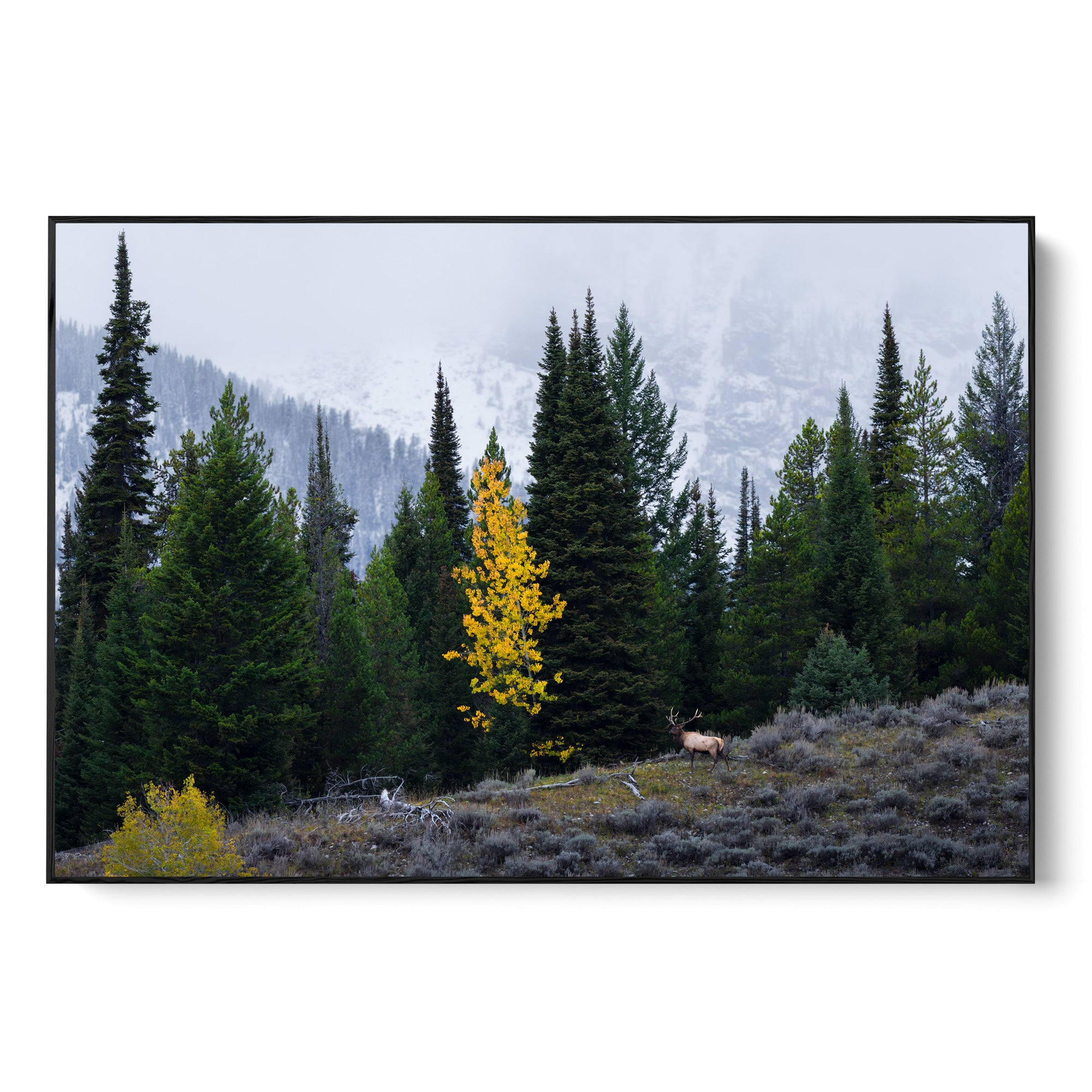 As I always say, there are always captivating, dramatic stories playing out right in front of us throughout Creation. Here, a bull elk wards off a nearby foe with a bugle that resonates throughout the hole as his haram feeds below. However, as we can see in the background, autumn is quickly coming to an end with the snow line steadily moving lower and lower on the Tetons towards the valley floor.