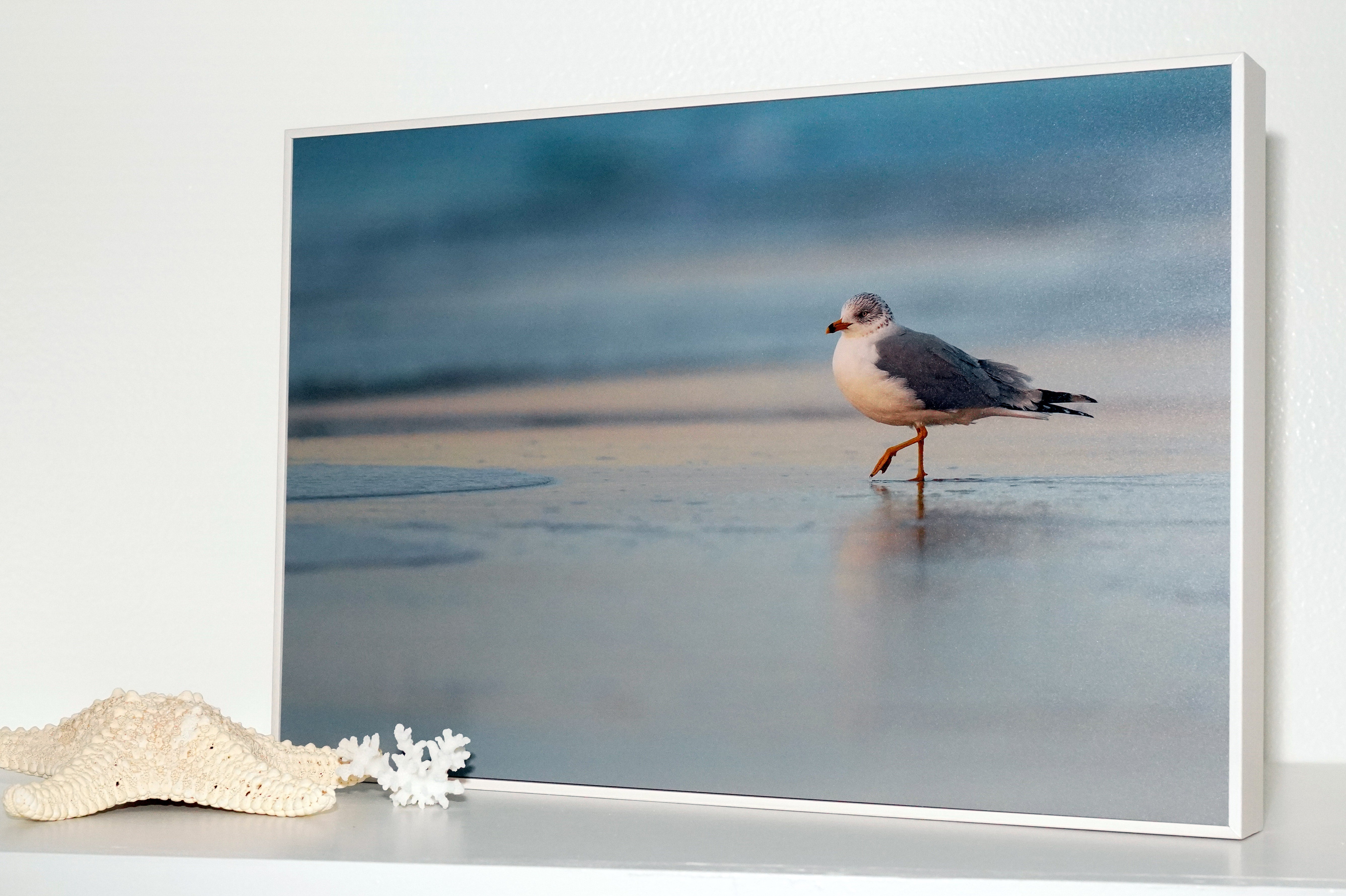 This ring-billed gull slowly marches along the surf, as the pre-sunrise alpenglow creates beautifully soft pastel hues upon the waters.