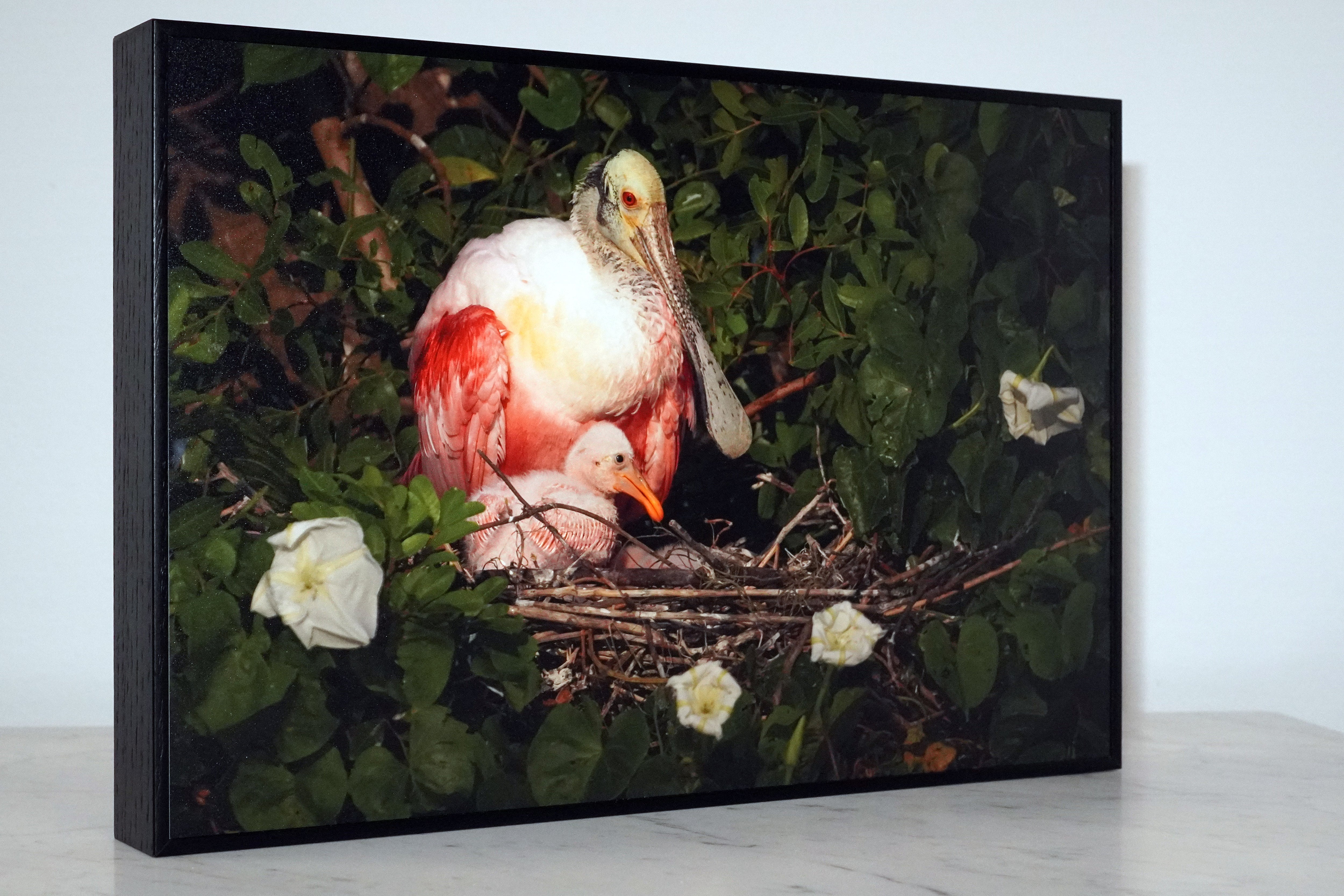 This roseate spoonbill mother proudly lays her red eyes upon her rosy baby.