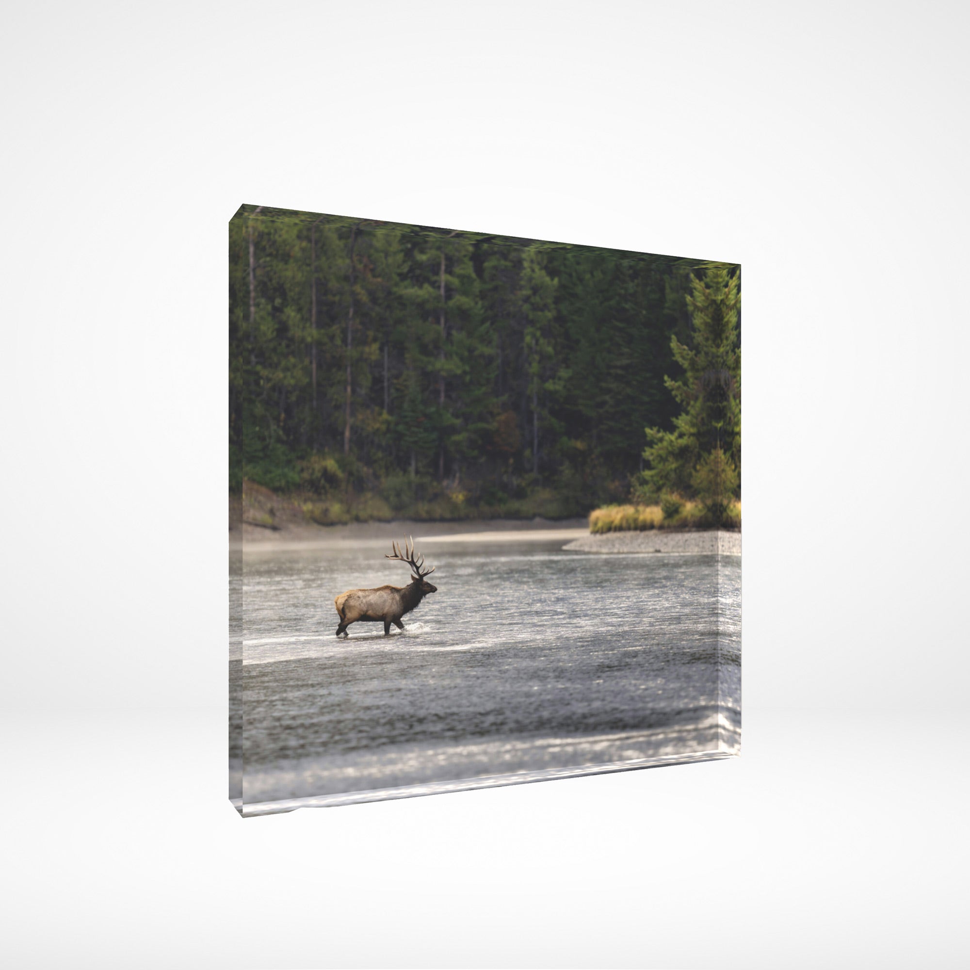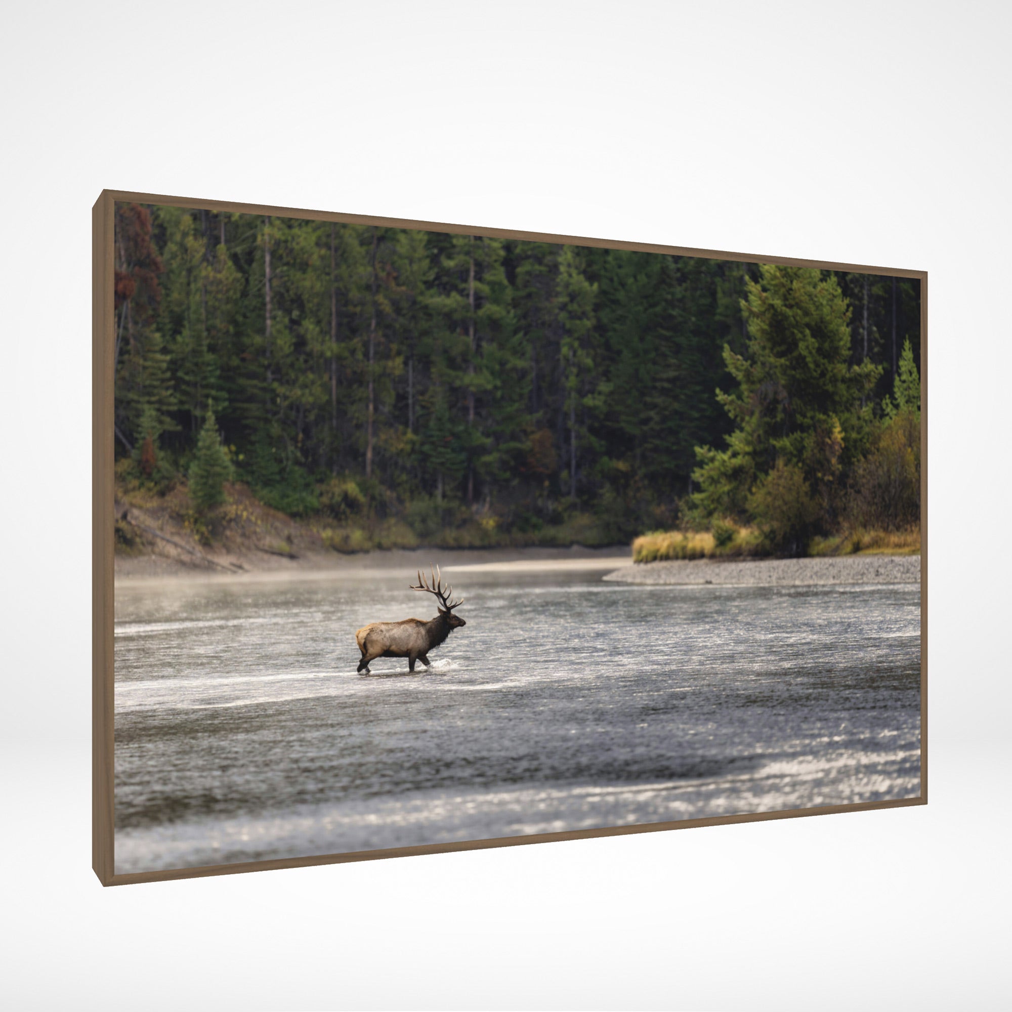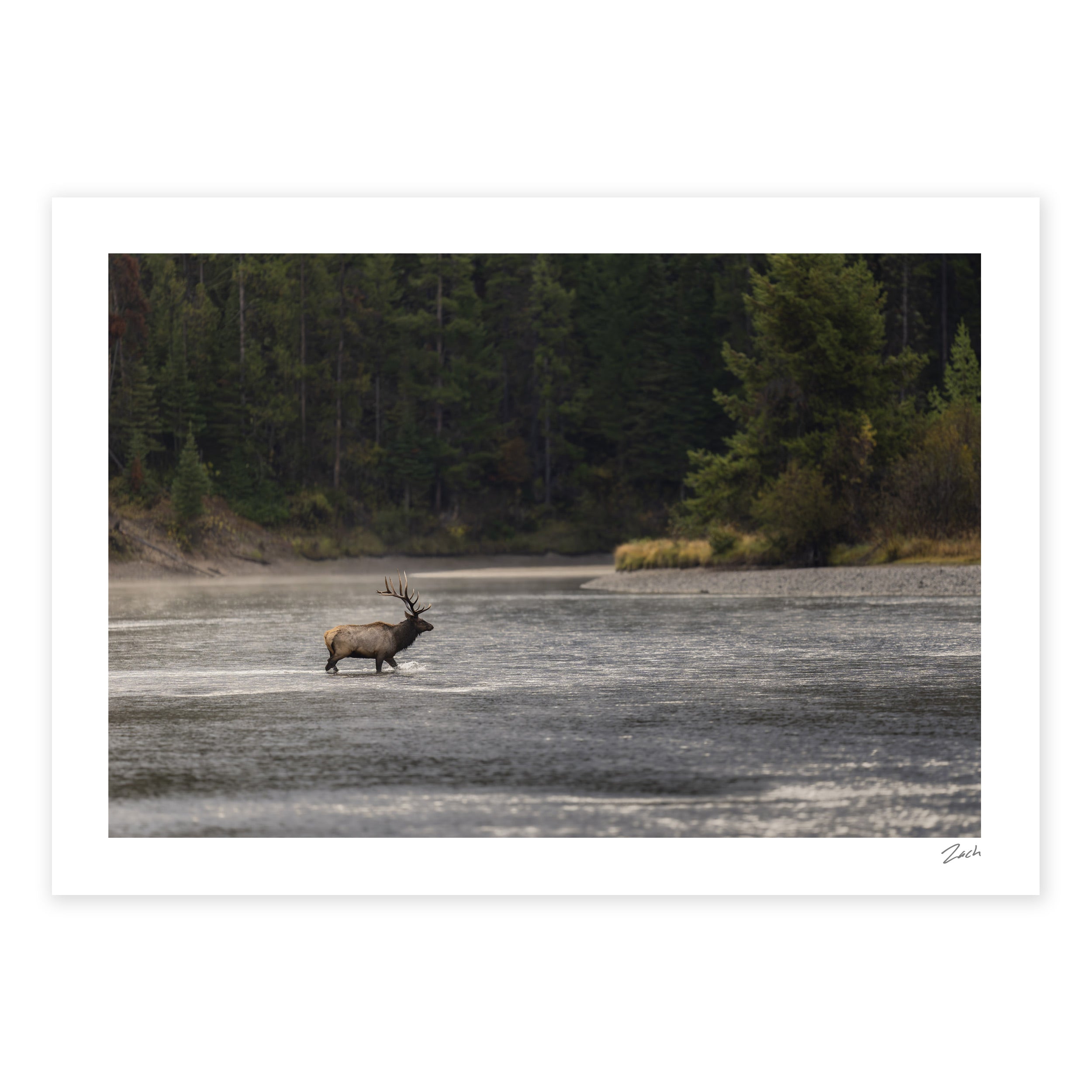 On a calm and windless autumn morning, the Snake River calmly flows, interrupted only by the careful steps of this majestic bull elk following his harem into the woods.